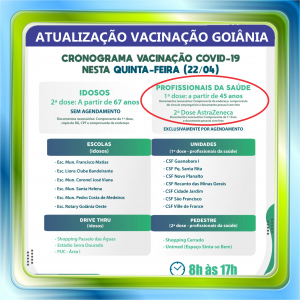 A Secretaria Municipal de Saúde de Goiânia (SMS), afirmou que o Plano de Vacinação contra a Covid-19 em trabalhadores da saúde, segue nesta quinta-feira (22), com aplicação de primeira dose em profissionais da saúde com idade acima de 45 anos.